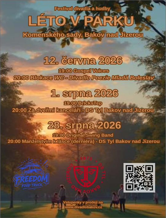 Festival divadla a hudby Vás zve na LÉTO V PARKU do Bakova nad Jizerou (Komenského sady) dne 12. 6. 2026, 1. 8. 2026 a 28. 8. 2026.